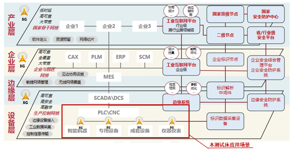 本測(cè)試床屬于AII總體架構(gòu)中網(wǎng)絡(luò)互聯(lián)部分,其應(yīng)用場(chǎng)景在AII《工業(yè)互聯(lián)網(wǎng)體系架構(gòu)(版本2.0)》中的位置如下圖所示。在關(guān)鍵技術(shù)驗(yàn)證上,本測(cè)試床重點(diǎn)測(cè)試驗(yàn)證5G端到端確定性技術(shù)在高精度時(shí)間同步精度、可靠性、時(shí)延和抖動(dòng)等維度可提供的通信服務(wù)能力;在應(yīng)用場(chǎng)景驗(yàn)證上,本測(cè)試床重點(diǎn)測(cè)試驗(yàn)證5G確定性通信技術(shù)應(yīng)用于PLC南向控制現(xiàn)場(chǎng)設(shè)備的能力和效果。