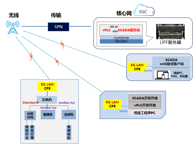 從5G UE下掛的SCADA客戶端訪問(wèn)UPF服務(wù)器內(nèi)置的非實(shí)時(shí)應(yīng)用SCADA服務(wù)和實(shí)時(shí)vPLC業(yè)務(wù)