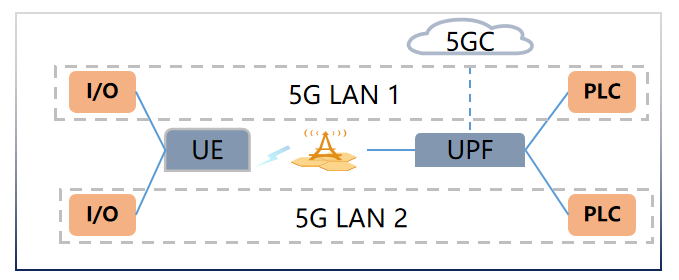 通過(guò)5G LAN組網(wǎng),5G LAN內(nèi)部的組播通信,實(shí)現(xiàn)主備PLC的冗余部署。