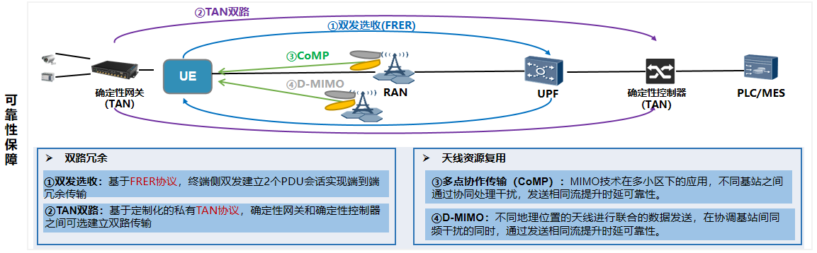 5G網(wǎng)絡(luò)的可靠性保障,主要通過(guò)冗余傳輸來(lái)實(shí)現(xiàn),包括無(wú)線空口的冗余傳輸、5G內(nèi)部的冗余傳輸(TSN 802.1CB)、業(yè)務(wù)級(jí)的冗余傳輸(比如基于TAN協(xié)議)等。