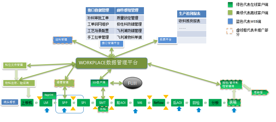 2)創新的開發出基于“云管端”的全球物料追溯系統(如圖11所示)。該平臺實現對激光打碼機、錫膏印刷機、SPI、貼片機、前AOI、回流焊爐、后AOI等工位各項數據采集功能。同時通過單板段導入REELID追溯系統,實現物料端到端可視與追溯。關鍵工位的采集數據都與板號關聯,實現產品在工廠各個工位的生產(包括不良維修操作)履歷查詢及產品中各個物料全方位追溯(包括出廠售后等其生命周期各個環節),所有關鍵追溯全面覆蓋。該平臺為智能工廠實現無紙化工藝、精準物料管控與自動化工藝管理打下基礎,同時大幅提升了產品質量。