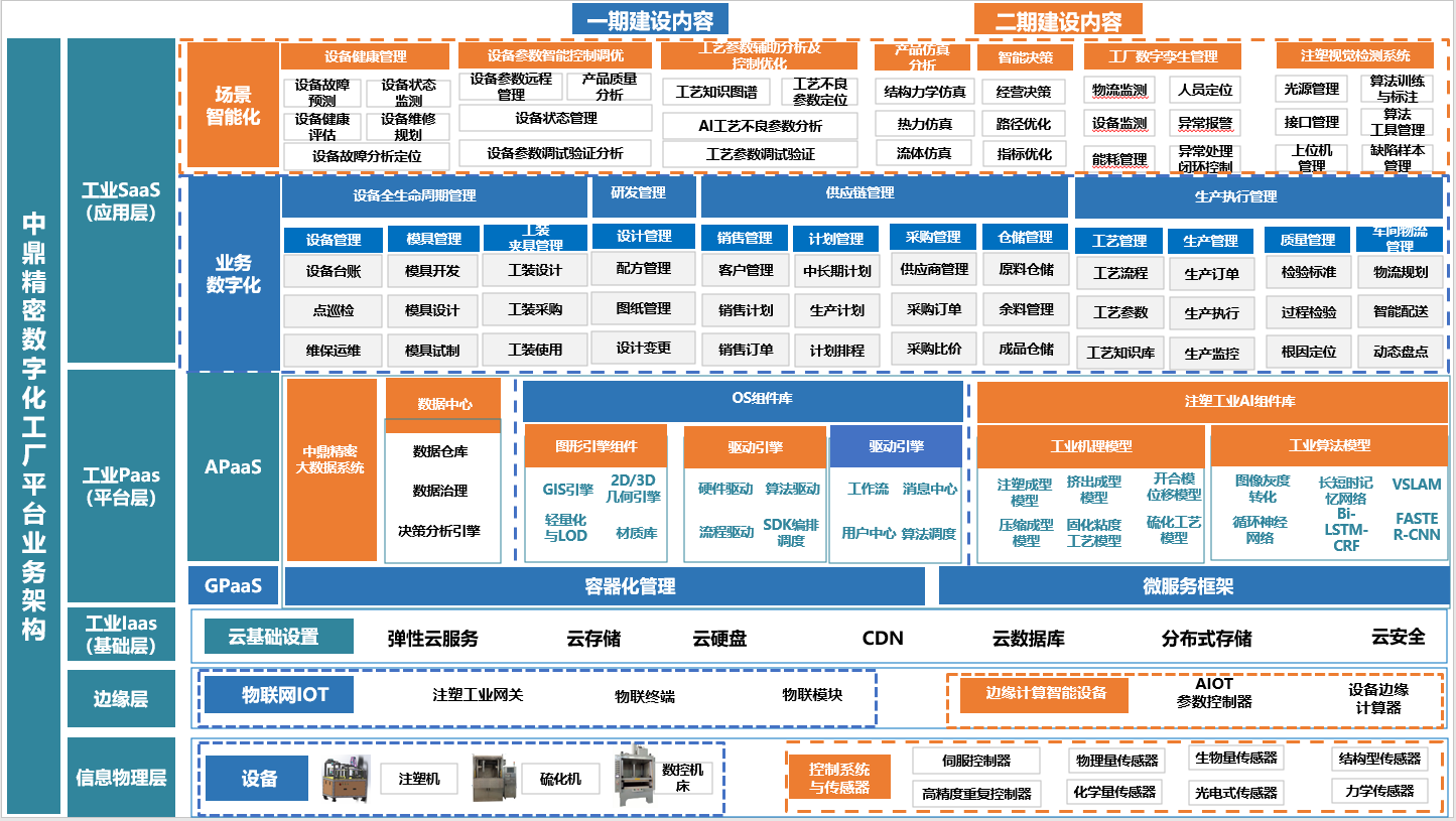 根據(jù)中鼎精密的數(shù)智化工廠平臺(tái)業(yè)務(wù),整體上按照工業(yè)互聯(lián)網(wǎng)及智能工廠技術(shù)架構(gòu),共部署5層業(yè)務(wù)架構(gòu),包括信息物理層、邊緣層、工業(yè)IaaS層、工業(yè)PaaS層(平臺(tái)層)、工業(yè)SaaS層(包括業(yè)務(wù)數(shù)字化和場景智能化)