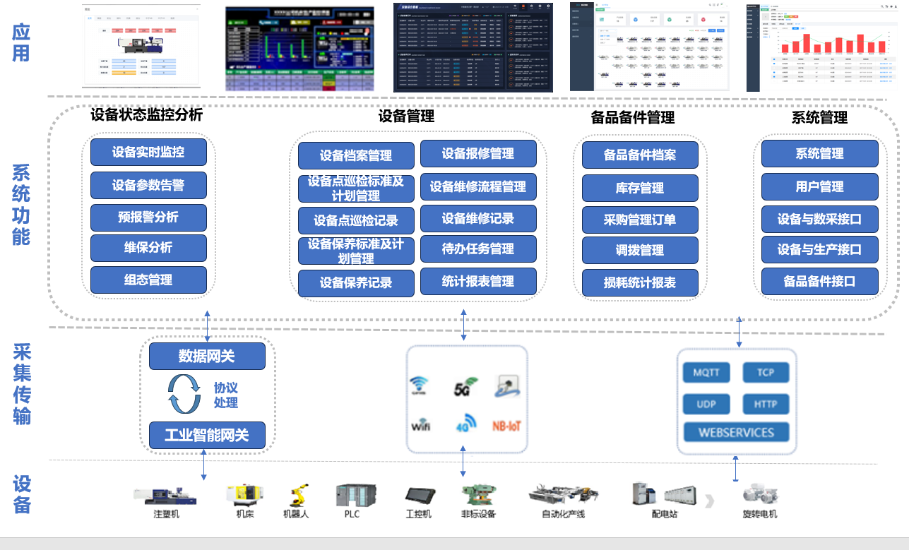 基于物聯(lián)網(wǎng)架構(gòu)實(shí)現(xiàn)從注塑設(shè)備數(shù)據(jù)采集與實(shí)時(shí)監(jiān)測到設(shè)備管理、工裝模夾具管理,實(shí)現(xiàn)互聯(lián)互通;建設(shè)設(shè)備維保及工藝知識(shí)庫,奠定后續(xù)設(shè)備智能維保及工藝優(yōu)化應(yīng)用基礎(chǔ)。