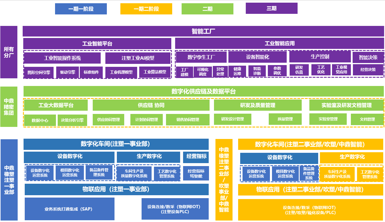 云計(jì)算、5G、物聯(lián)網(wǎng)、大數(shù)據(jù)、邊緣計(jì)算、工業(yè)AI、混合現(xiàn)實(shí)(XR)、工業(yè)互聯(lián)網(wǎng)平臺(tái)技術(shù)為支撐,結(jié)合中鼎精密注塑行業(yè)特點(diǎn)和需求,打造中鼎精密集團(tuán)智能制造工廠。