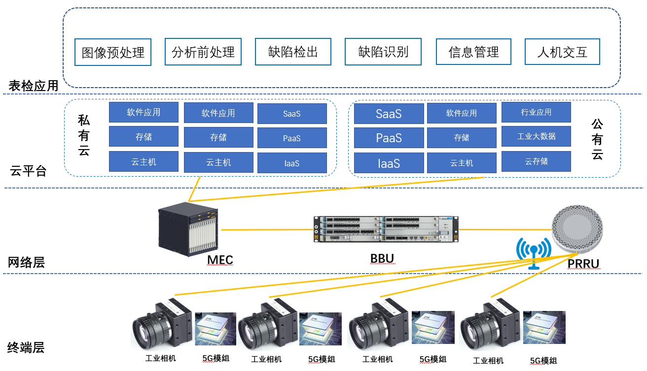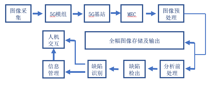 為解決以上表面質量檢測系統以及網絡連接的問題,本項目根據鋼鐵行業的質量檢測目前現狀,結合工業互聯網、機器視覺研究、5G網絡及MEC、大數據平臺、云計算等技術,利用工業相機拍攝高清圖片,通過5G網絡將檢測圖像上傳至云平臺,結合大數據分析圖像數據,給出數據分析檢測結果。依托5G網絡的大帶寬和低時延特性,使得系統的高清圖像得以快速上傳和分析,滿足生產線高速運轉的要求。本項目引入MEC工業邊緣云,將本地應用進行數據分流,實現工業數據不出廠,保障工業數據安全和信息安全。同時,本項目在帶鋼表面檢測系統中的圖像處理軟件、圖像拼接合成軟件、缺陷檢出算法、缺陷識別分類等模塊,在5G網絡中的5G模組、MEC服務器及5G核心網軟件均自主研發,開發基于工業邊緣云的質量檢測算法。本項目為鋼鐵企業提供工業相機、5G網絡接入、MEC服務、工業云平臺、帶鋼表面檢測系統應用等端到端解決方案,以服務模式向鋼鐵企業提供服務,減少鋼鐵企業在網絡、表檢系統方面的投資和維護成本。本項目可快速復制到鋼鐵行業其他產品的表面質量檢測場景,也可以推廣到其他型材制造業、造紙業等行業。