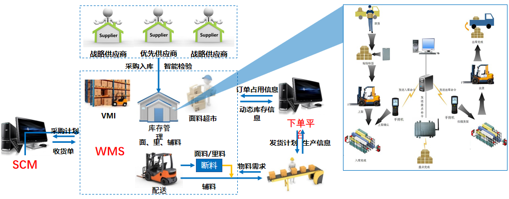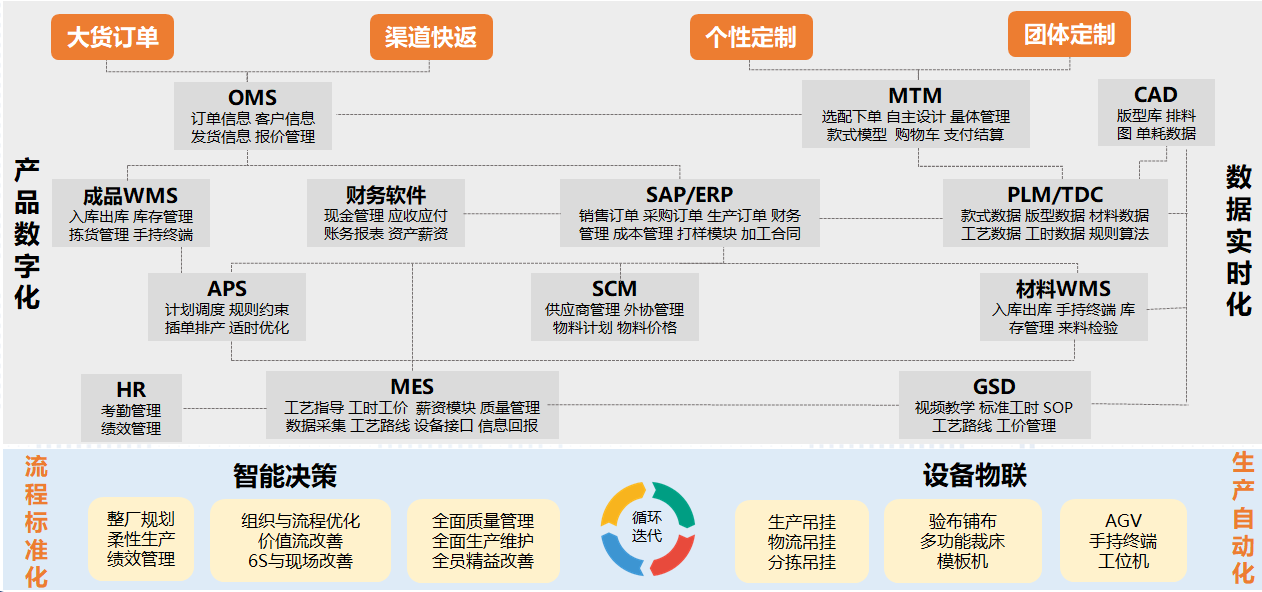 海思堡項目通過產品數字化及數據實時化,通過OMS定制下單系統,輔助AI量體,實現用戶個性化定制下單,由TDC技術數據中心實現工藝、版型等的自動處理,并通過CAD實現版型生成。SCM與WMS系統,實現供應商高效協同與物料精準管理,由APS高效排產,MES信息化驅動裁剪、縫制、后整、包裝全生產過程,成品WMS及TMS對接,實現成品的高效管理及實時追蹤?;谏鲜龅娜鞒绦畔⒒桨福瑫r,對接鋪布、視覺檢測、裁剪、吊掛、AGV、分揀、亮燈、手持機等自動化設備和應用,實現大規模個性化定制的服裝智能制造解決方案。
