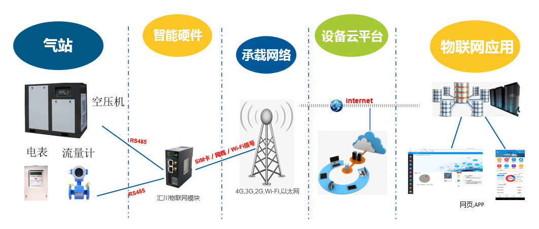采集端:空壓機(jī)氣站加裝支持Modbus RTU的通信模塊的電表和流量計(jì);用氣終端加裝壓力計(jì)和流量計(jì);通過(guò)物聯(lián)網(wǎng)智能硬件采集模塊,將空壓站的用電用氣數(shù)據(jù),空壓機(jī)實(shí)時(shí)運(yùn)行數(shù)據(jù),用氣端的數(shù)據(jù),通過(guò)4G/3G上傳至工業(yè)云平臺(tái),實(shí)現(xiàn)流量監(jiān)測(cè)、用電監(jiān)測(cè)、氣壓監(jiān)測(cè)、遠(yuǎn)程抄表等應(yīng)用。