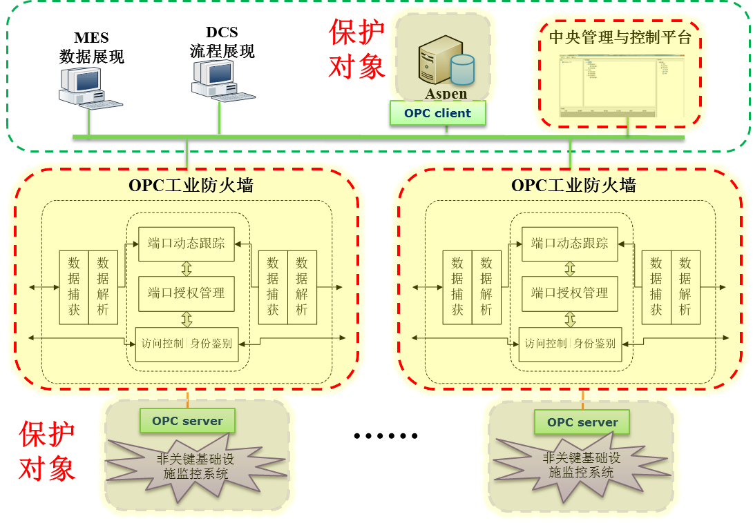 新興鑄管廠的OPC工業(yè)防火墻安全防護(hù)的總體架構(gòu)如圖所示,OPC工業(yè)防火墻保護(hù)每個(gè)控制系統(tǒng)區(qū)域,部署在控制系統(tǒng)區(qū)域出口,進(jìn)行區(qū)域隔離,避免病毒擴(kuò)散,對(duì)OPC協(xié)議進(jìn)行解析、動(dòng)態(tài)端口管理、完整性檢查等,避免病毒攻擊。安全管控平臺(tái)為統(tǒng)一的集中管理OPC工業(yè)防火墻,部署在同Aspen數(shù)據(jù)庫(kù)同一層,對(duì)整個(gè)工業(yè)智能控制網(wǎng)絡(luò)進(jìn)行實(shí)時(shí)監(jiān)控,對(duì)報(bào)警及消息日志進(jìn)行歷史存儲(chǔ)與分析。