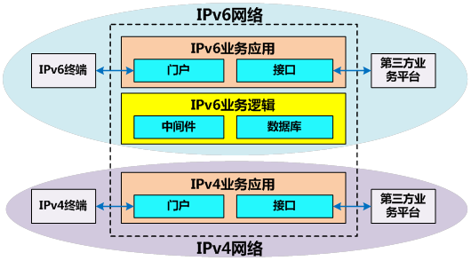 將業(yè)務(wù)平臺升級到IPv6后,IPv4和IPv6應(yīng)用將并存。如下圖所示,將IPv4業(yè)務(wù)平臺的部分應(yīng)用升級到IPv6,包括對外門戶和接口、核心業(yè)務(wù)邏輯,同時(shí)為了兼容IPv4用戶以及其它相關(guān)系統(tǒng),保留原有IPv4業(yè)務(wù)平臺的對外門戶和接口暫時(shí)不變,核心業(yè)務(wù)交由IPv6核心業(yè)務(wù)邏輯處理。升級完成后,IPv4對外門戶和接口為IPv4用戶提供服務(wù),IPv6對外門戶和接口為IPv6用戶提供服務(wù),核心業(yè)務(wù)邏輯升級成IPv6實(shí)現(xiàn)共用。