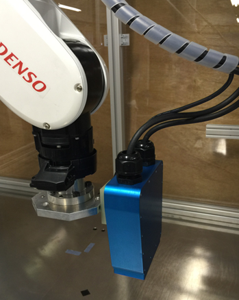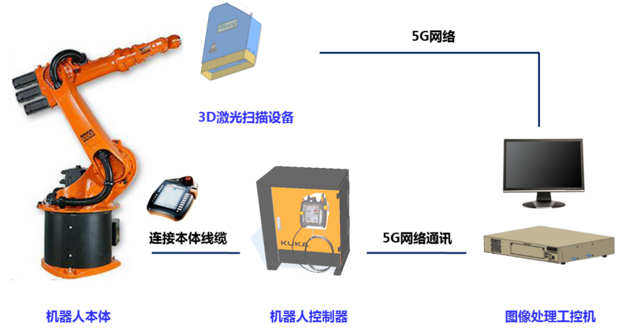 在涂膠機(jī)器人手臂加裝3D激光掃描設(shè)備,智能相機(jī)和補(bǔ)光設(shè)備,因機(jī)器手臂需進(jìn)行靈活作業(yè),所以數(shù)據(jù)通訊不能采用傳統(tǒng)的網(wǎng)線接入的方式,同時因3D掃描數(shù)據(jù)是動態(tài)數(shù)據(jù)傳輸,需實(shí)時傳輸且數(shù)據(jù)量較大,需借助5G網(wǎng)絡(luò)實(shí)現(xiàn)大數(shù)據(jù)同步傳輸,便于圖像處理系統(tǒng)能依據(jù)數(shù)據(jù)實(shí)時成像,其架設(shè)示例如下:紅框標(biāo)注部分為3D激光掃描設(shè)備和智能相機(jī)。