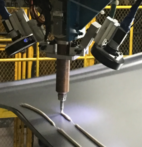 在涂膠機(jī)器人手臂加裝雙攝像頭,并配置補(bǔ)光設(shè)備,于膠槍兩側(cè)跟隨膠槍移動拍攝,將海量圖片通過5G網(wǎng)絡(luò)傳遞給圖像處理系統(tǒng),下圖是設(shè)備安裝的示意圖: