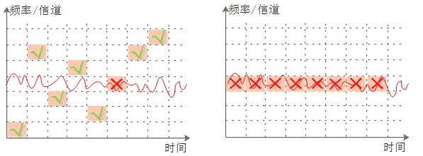 跳頻,通過在多個信道間進行隨機選擇信道進行數(shù)據(jù)發(fā)送,通過跳頻技術可以解決突發(fā)的隨機干擾,獲得抗干擾增益。