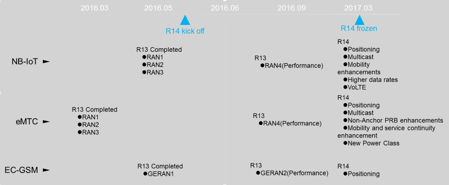 3GPP標準定義了基于授權頻譜的蜂窩IoT技術,包括NB-IoT,EC-GSM和eMTC,具體的演進路標如下: