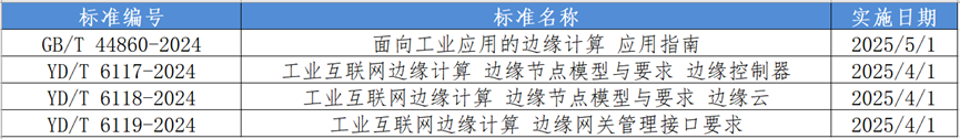 2024年9月20日,工信部印發(fā)《工業(yè)重點(diǎn)行業(yè)領(lǐng)域設(shè)備更新和技術(shù)改造指南》的通知,提出“部署邊緣計(jì)算節(jié)點(diǎn)、邊緣計(jì)算網(wǎng)關(guān)、邊緣控制器、邊緣云等工業(yè)算力設(shè)備”要求,明確“力爭到2027年,80%的規(guī)模以上制造業(yè)企業(yè)基本實(shí)現(xiàn)網(wǎng)絡(luò)化改造,邊緣網(wǎng)關(guān)、邊緣控制器等產(chǎn)品部署超過100萬臺(tái)”目標(biāo)。2024年10月26日,由機(jī)械工業(yè)儀器儀表綜合技術(shù)經(jīng)濟(jì)研究所、中國信息通信研究院(以下簡稱“中國信通院”)、中國科學(xué)院沈陽自動(dòng)化研究所等聯(lián)合牽頭的《面向工業(yè)應(yīng)用的邊緣計(jì)算 應(yīng)用指南》國家標(biāo)準(zhǔn)正式發(fā)布。2024年12月25日,《工業(yè)互聯(lián)網(wǎng)邊緣計(jì)算 邊緣節(jié)點(diǎn)模型與要求 邊緣控制器》、《工業(yè)互聯(lián)網(wǎng)邊緣計(jì)算 邊緣節(jié)點(diǎn)模型與要求 邊緣云》、《工業(yè)互聯(lián)網(wǎng)邊緣計(jì)算 邊緣網(wǎng)關(guān)管理接口要求》等3項(xiàng)工業(yè)互聯(lián)網(wǎng)邊緣計(jì)算行業(yè)標(biāo)準(zhǔn)正式發(fā)布。