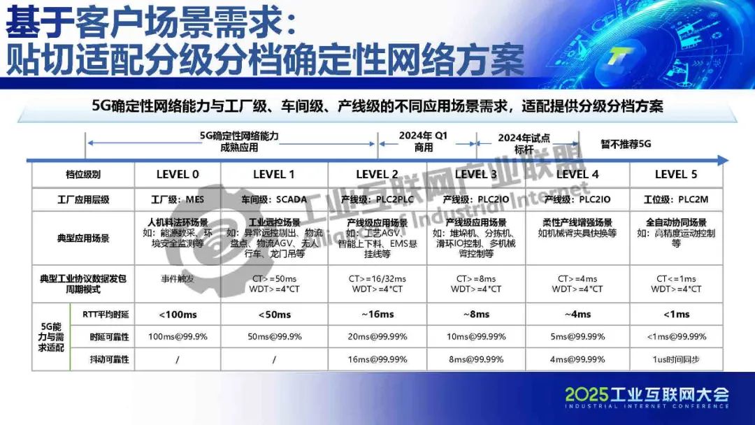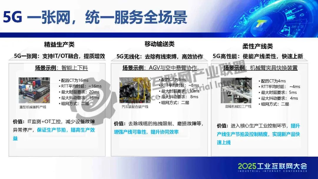 5G一張網(wǎng)打通IT與OT,突破接口協(xié)議兼容、網(wǎng)絡(luò)確定性等核心技術(shù),實(shí)現(xiàn)“數(shù)據(jù)上得來、管理下得去”,支持柔性化、智能化生產(chǎn)。