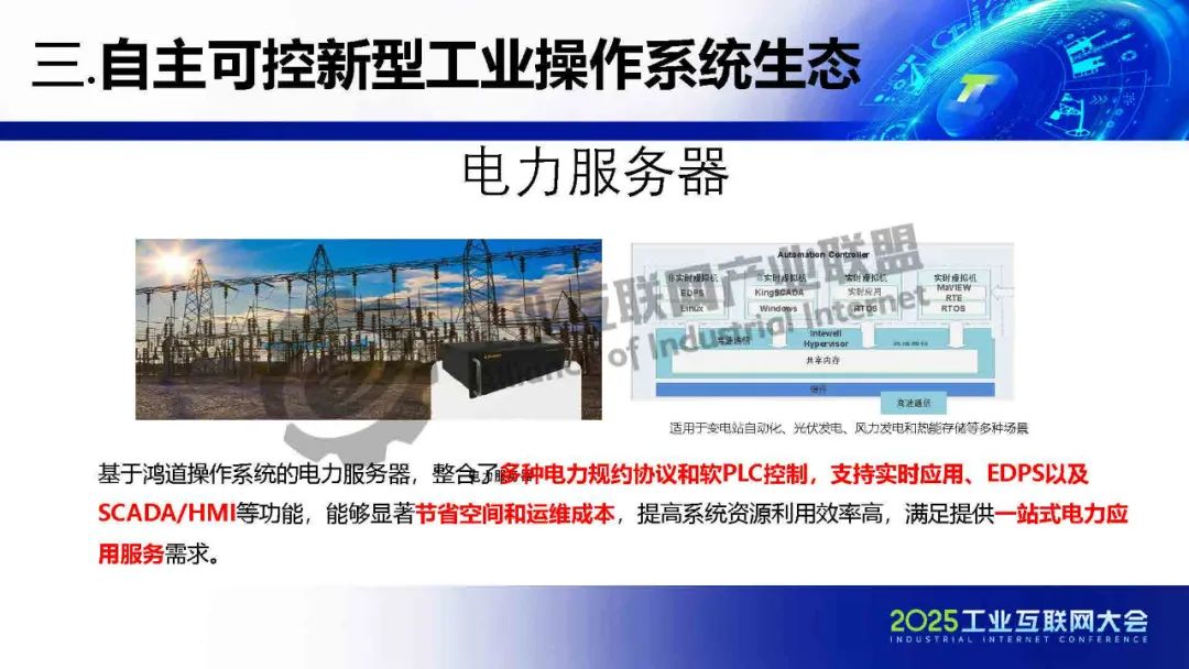 程遠(yuǎn)介紹,未來(lái)新型工業(yè)化的發(fā)展趨勢(shì)是控制、計(jì)算、通信、人工智能的融合,是推動(dòng)全球工業(yè)控制底層技術(shù)的變革?;邙櫟啦僮飨到y(tǒng)的電力服務(wù)器,整合了多種電力規(guī)約協(xié)議和軟PLC控制,支持實(shí)時(shí)應(yīng)用、EDPS以及SCADA/HMI等功能,能夠顯著節(jié)省空間和運(yùn)維成本,提高系統(tǒng)資源利用效率高,滿足提供一站式電力應(yīng)用服務(wù)需求。