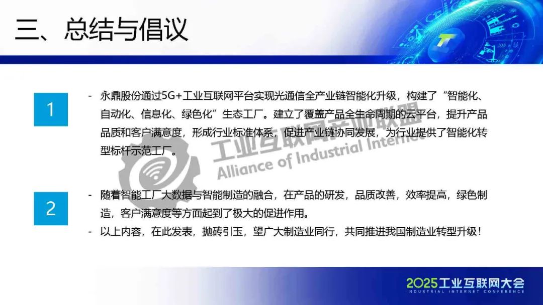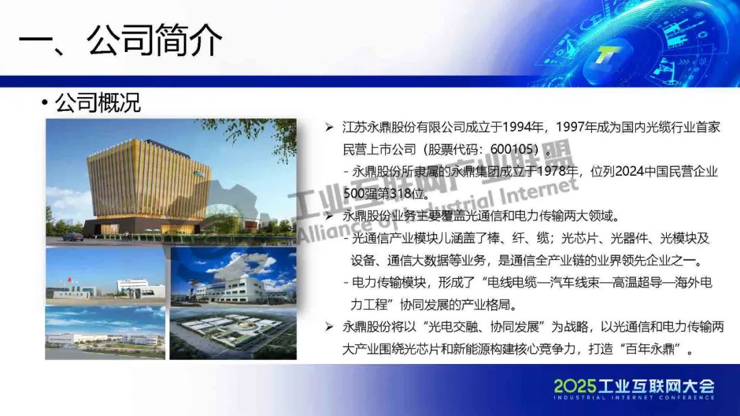 5月21日,在2025工業(yè)互聯(lián)網(wǎng)大會(huì)“工業(yè)互聯(lián)網(wǎng)數(shù)智融合創(chuàng)新發(fā)展專題活動(dòng)”上,永鼎股份光棒、光纖公司副總經(jīng)理顧宏亮發(fā)表了《智能制造示范工廠建設(shè)匯報(bào):棒纖纜全產(chǎn)業(yè)鏈智能制造實(shí)踐》的主題演講。