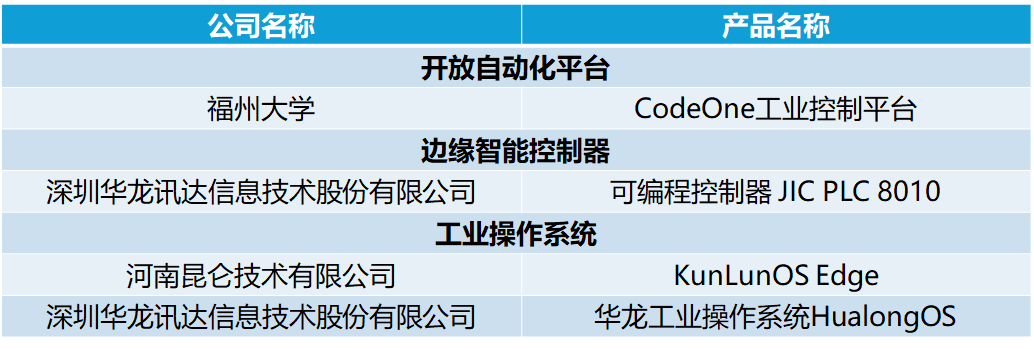 本次通過測試產品包括邊緣智能控制器、工業操作系統、開放自動化平臺等,共有來自深圳華龍訊達信息技術股份有限公司、河南昆侖技術有限公司、福州大學等企業和高校的四款產品通過首批測試,具體名單如下。