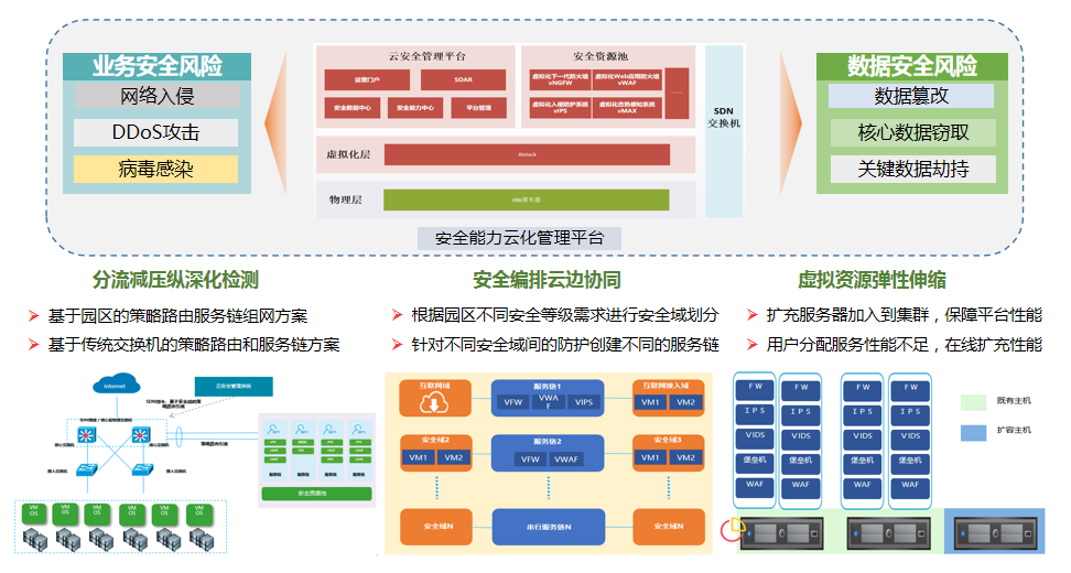 圍繞SDN、安全資源池、云安全管理平臺3大模塊,構建云化網絡防護能力,安全能力部署在UPF近源側,通過分流減壓縱深化檢、安全編排云邊協同、虛擬資源彈性伸縮多維度安全協同,為企業客戶打造專屬的安全解決方案,對企業網絡進行全流量安全監控,保障園區資產的安全訪問與使用。