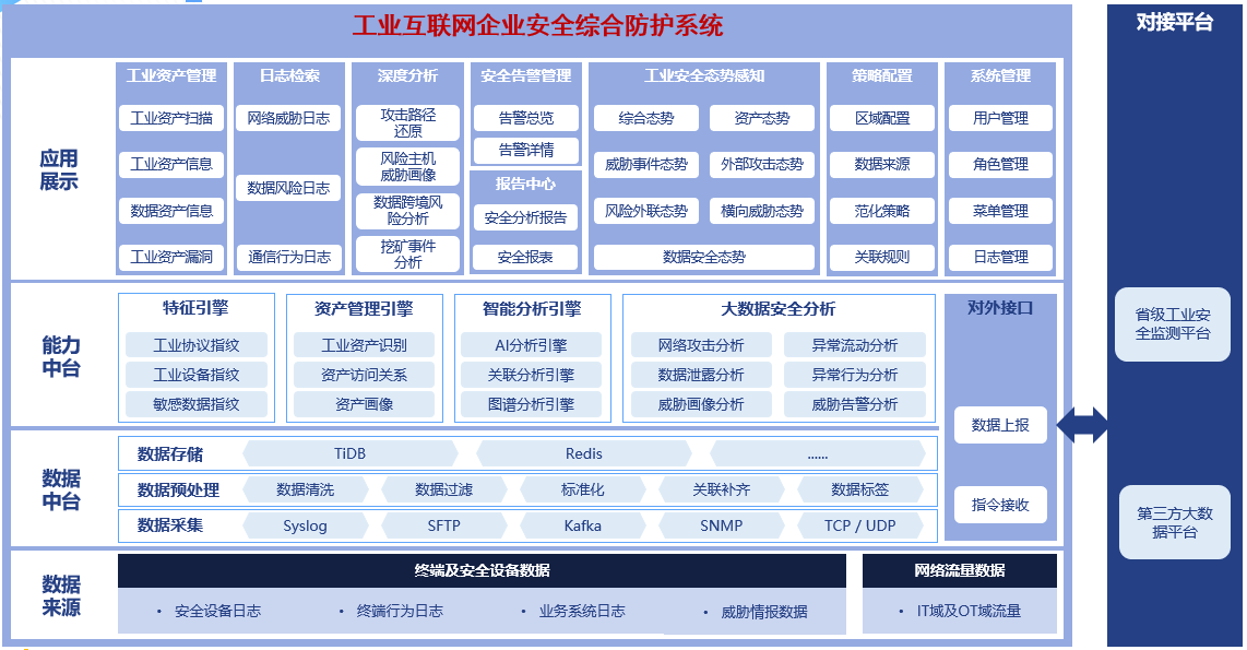 國家工業互聯網安全態勢感知與風險預警平臺:建立國家、省級、企業級聯動的工業互聯網安全監管體系,實現重點行業、重點對象、重點風險的實時監測、動態感知、及時預警,支撐政府監管、服務企業防護。