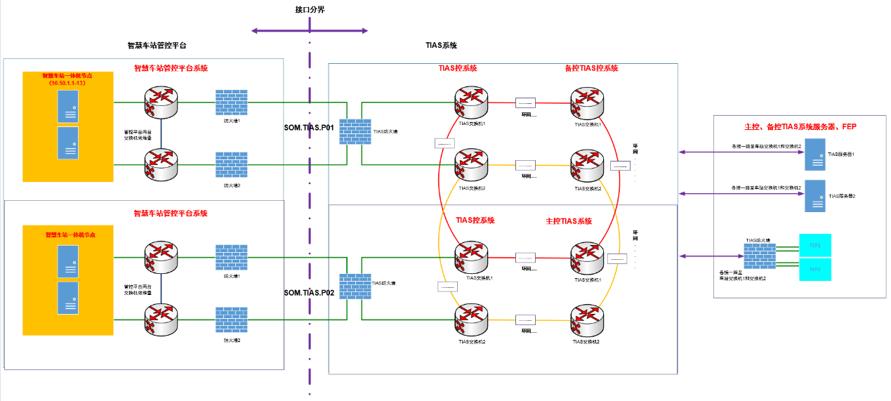 智慧車站運營管控平臺需接入TIAS系統,該平臺功能上設計為站級TIAS系統的上位系統,即通過該平臺實現對TIAS中綜合監控部分的設備監控;網絡上,該系統需要在本站訪問TIAS服務器、FEP并通過TIAS環網分別訪問主控、備控的TIAS實時服務器(機電)、FEP,以及實現兩個車站的運營管控平臺網絡互通(僅限于一體機的部分業務虛擬節點),傳輸內容為常規綜合監控監控數據。接口界面如圖5-2所示: