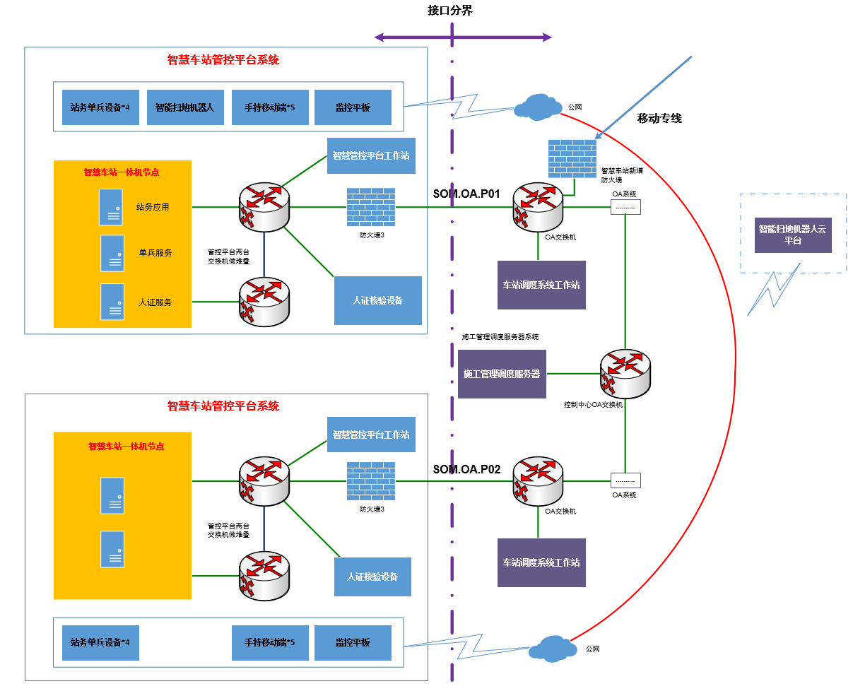 基于數據流進行梳理分析,智慧車站運營管控平臺需接入TIAS系統,該平臺功能上設計為站級TIAS系統的上位系統,即通過該平臺實現對TIAS中綜合監控部分的設備監控;網絡上,該系統需要在本站訪問TIAS服務器、FEP,并通過TIAS環網分別訪問主控、備控的TIAS實時服務器(機電)、FEP,以及實現兩個及以上車站的運營管控平臺網絡互通(僅限于一體機的部分業務虛擬節點),傳輸內容為常規綜合監控監控數據,不含視頻流。智能掃地機器人、站務單兵設備、手持移動終端、監控平板(均設置靜態IP)通過無線與車站公網連接,車站公網通過控制中心公網與控制中心OA系統的接口實現上述設備與車站OA系統的通信。