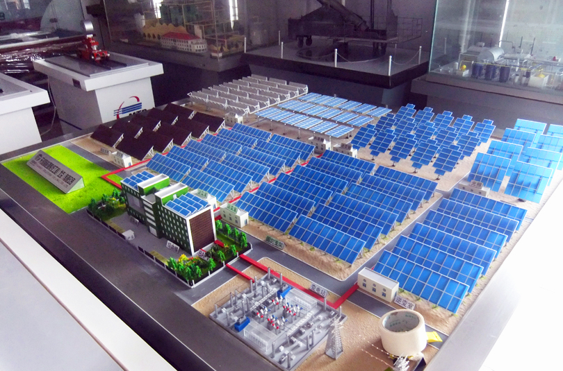 場景模擬:場景根據實際光伏發電場景定制,等比例縮小仿真。沙盤示意圖及展示效果如下: