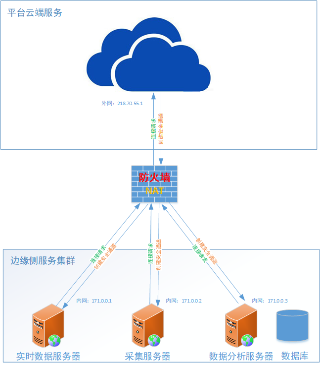 提供NAT或防火墻應用場景下邊云互連的解決方案:在互聯網環境下,處于NAT或防火墻后端的邊緣側服務不能暴露于公網或需與外界做單向的安全隔離,這就要求邊緣側和云端不能采用常規的互連機制,平臺使用反向連接技術,由邊緣側向云端主動發起連接請求,然后服務端在此通道基礎上構建安全連接,從而跨越防火墻或NAT連接障礙,同時又不降低連接的安全性。