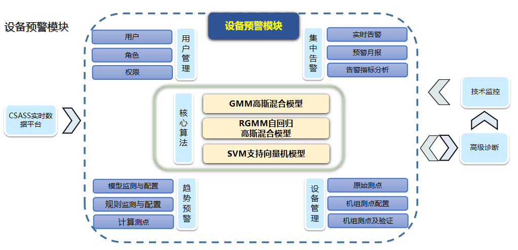 2、CSASS分析專家系統(tǒng)依托云平臺(tái)設(shè)計(jì)了設(shè)備預(yù)警、高級(jí)診斷、RCM、自動(dòng)優(yōu)化、能耗分析、負(fù)荷優(yōu)化、燃料分析、技術(shù)監(jiān)控等8大功能應(yīng)用模塊和一個(gè)大數(shù)據(jù)分析模塊,功能應(yīng)用模塊圍繞提高機(jī)組運(yùn)行的經(jīng)濟(jì)性、可靠性和快速性等方面設(shè)置,使得機(jī)組能夠在確保安全、環(huán)保性的同時(shí)提高運(yùn)營(yíng)管理水平。