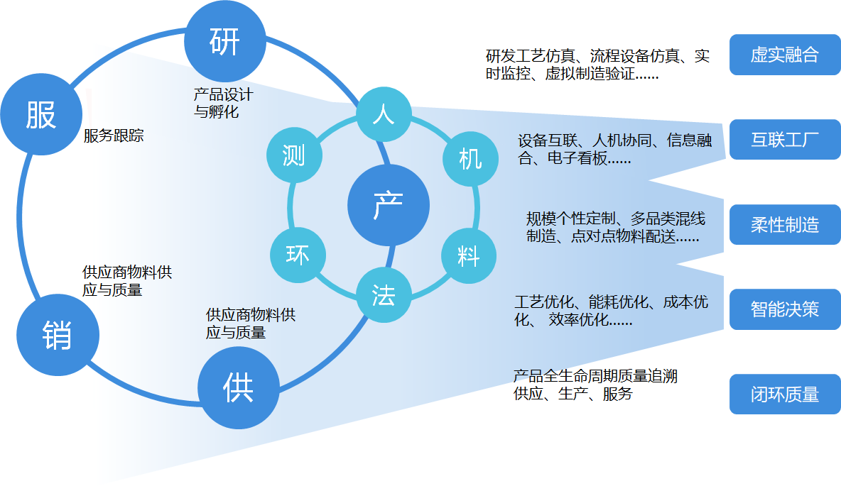 (1)建立多源設備、海量數據、異構網絡、多維場景的模擬環境,實現基于虛實深度融合,面向生產制造過程和設備后服務的輕量級數字孿生支持平臺和輕量化數字孿生產品,滿足生產流程和服務模式虛擬重構的仿真需求。通過數字孿生仿真環境,開展基于工業互聯網的人、機、料、法、環、測和研、產、供、銷、服“雙閉環”應用,持續豐富平臺在虛體世界上的模板、實例的數量和質量,提升工業智能新業態、新模式的試錯能力,降低智能制造實施成本和周期。
