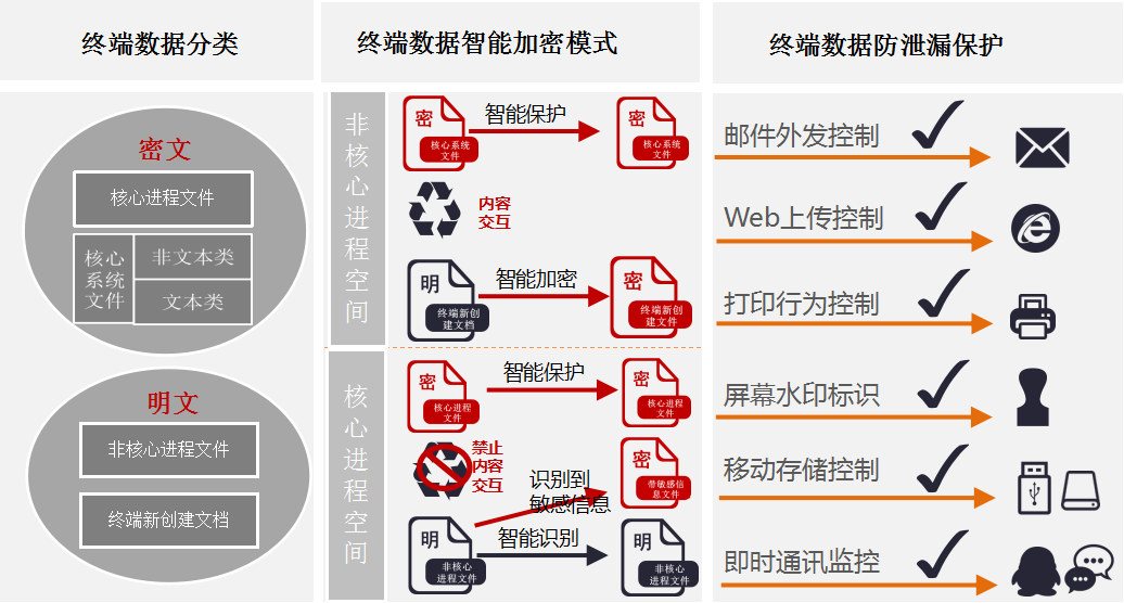 (1)終端數據智能安全防護:包括數據智能安全子系統、終端虛擬化桌面子系統、終端桌面安全子系統、終端外設控制子系統、文件透明加密子系統等五個子系統,有效防止機密信息泄漏。
