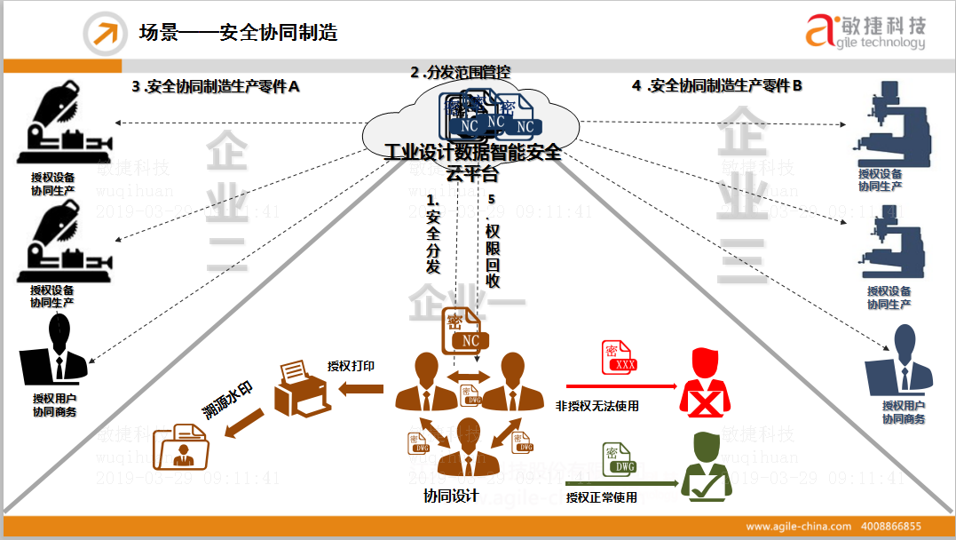 針對工業設計數據面臨的三大威脅,工業數據智能安全云平臺構建了面向工業設計數據全生命周期安全管理的解決方案,包括工業圖紙協同研發設計環節的安全可控,及圖紙下單給外協方的電子商務結算環節、出圖進行資源調配確定生產計劃環節,直至下發至智能車間生產環節,及后續產品發布環節的圖紙安全控制問題。