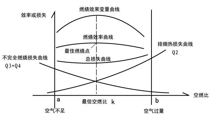 在鍋爐熱效率損失中,主要因素包括:排出煙氣所帶走的熱量、化學不完全燃燒熱損失、機械不完全燃燒熱損失,見下圖通用燃燒曲線: