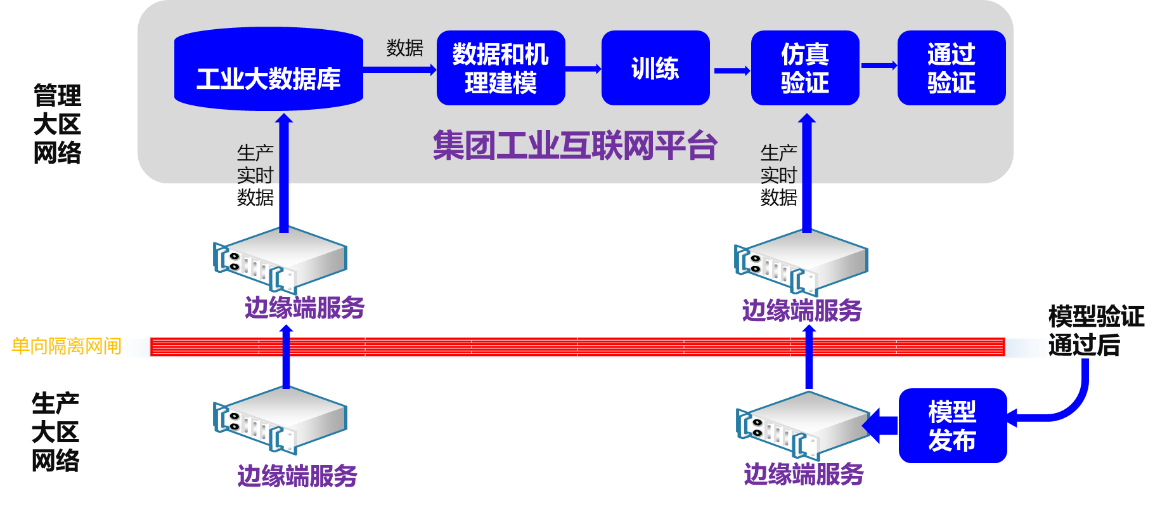 邊緣端服務負責采集生產實時數據(負荷、給煤量、主蒸汽壓力等),并通過單向隔離網閘接入數據到集團工業互聯網平臺。在集團工業互聯網平臺端,基于歷史和新增生產實時數據進行建模和訓練;并通過仿真手段,與實時數據進行比較驗證。一致時,表示通過驗證。