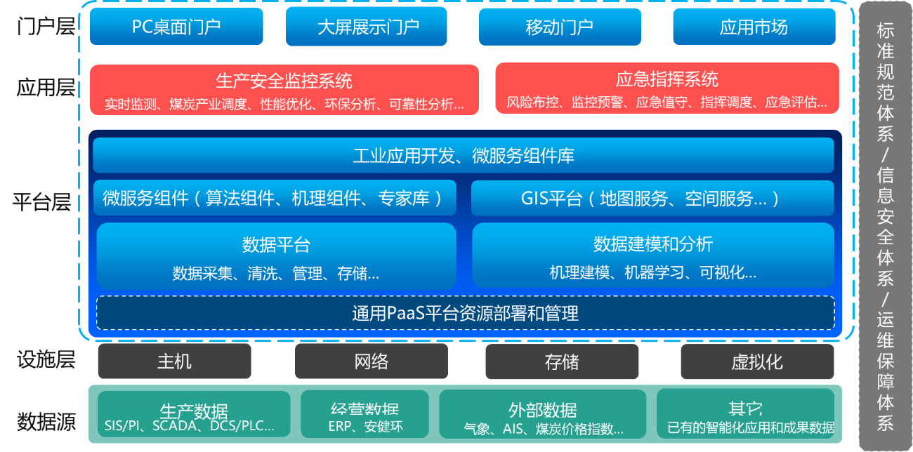應用層:包括實時監測、產業協同、性能優化、運行分析、環保分析、節能分析、可靠性分析等生產監控應用,包括風險防控、監控預警、預案管理、應急演練、分析研判、輔助決策、指揮調度、應急評估等應急管理應用。