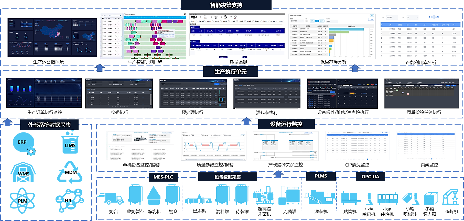 數字化工廠解決方案總體分為四個層面,一是建立智能工廠數據標準體系與運營體系;二是設備數采,優化設備數據采集,結合自動化設備改造,實現設備數采標準化、平臺化;三是打造數據平臺與行業大腦,充分融合設備數采數據,生產過程數據,外部信息系統數據,打破信息孤島,構建乳品行業知識圖譜;四是實現工廠智能輔助決策,利用大數據分析技術,支撐生產效率提升,設備綜合產能分析和工廠關鍵績效指標分析等。