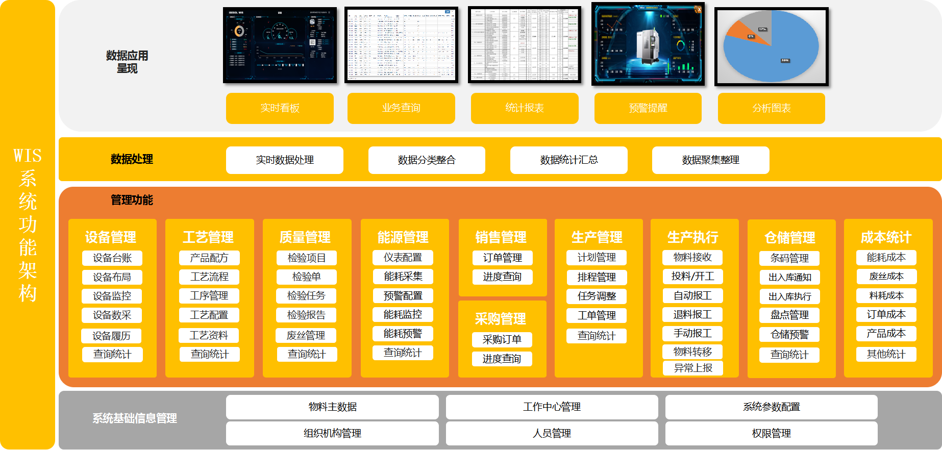 通過電子看板、統計報表、統計圖表等多樣的數據呈現方式,可實時掌握設備運行情況、訂單完成情況、產品質量情況、料耗情況、設備能耗情況、人員績效等,為企業生產管理決策提供實時有效的數據支撐。