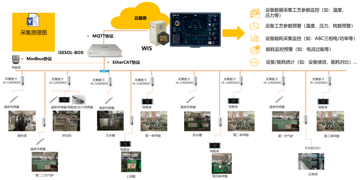 將生產設備聯網,設備運行數據采集及相關工段設備的能耗數據采集,解決設備運行數據孤島問題,實時掌握設備運行工藝參數、對工藝參數進行監控預警,保證產品生產質量,實時掌握設備能耗情況及全廠各部門的能耗情況、對全廠各部門能耗進行監控管理及統計分析