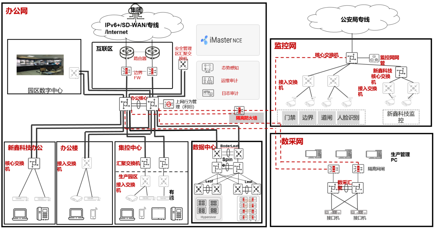視頻監控網、數采網通過網閘/防火墻接入辦公網絡。