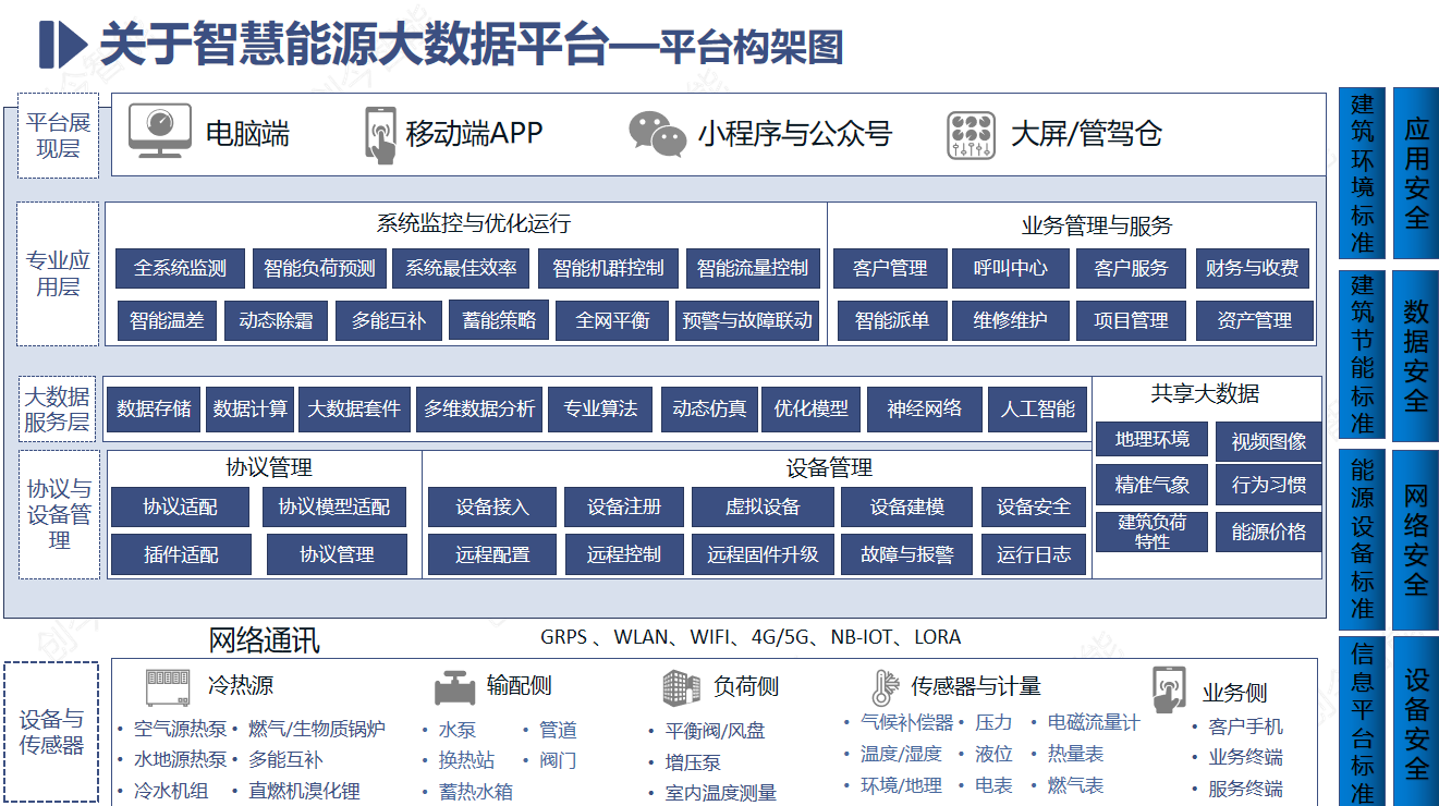 技術(shù)路線:智慧能源大數(shù)據(jù)平臺基于全面的系統(tǒng)運行數(shù)據(jù)監(jiān)測和分析,結(jié)合熱能、建筑環(huán)境行業(yè)眾多專業(yè)算法和最佳效率模型,