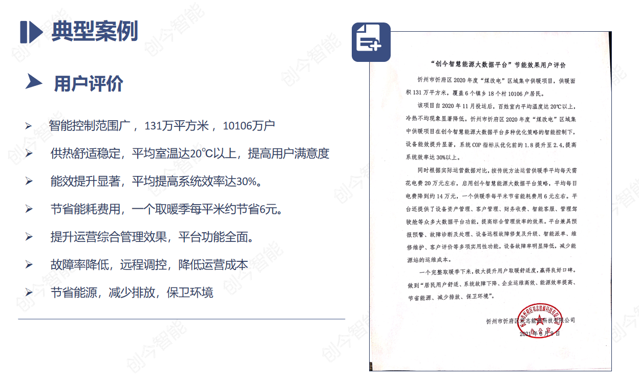 一個完整取暖季下來,極大提升用戶取暖舒適度,贏得良好口碑。做到“居民用戶舒適、系統(tǒng)故障下降、企業(yè)運維高效、能源效率提高、節(jié)省能源、減少排放、保護(hù)環(huán)境”。