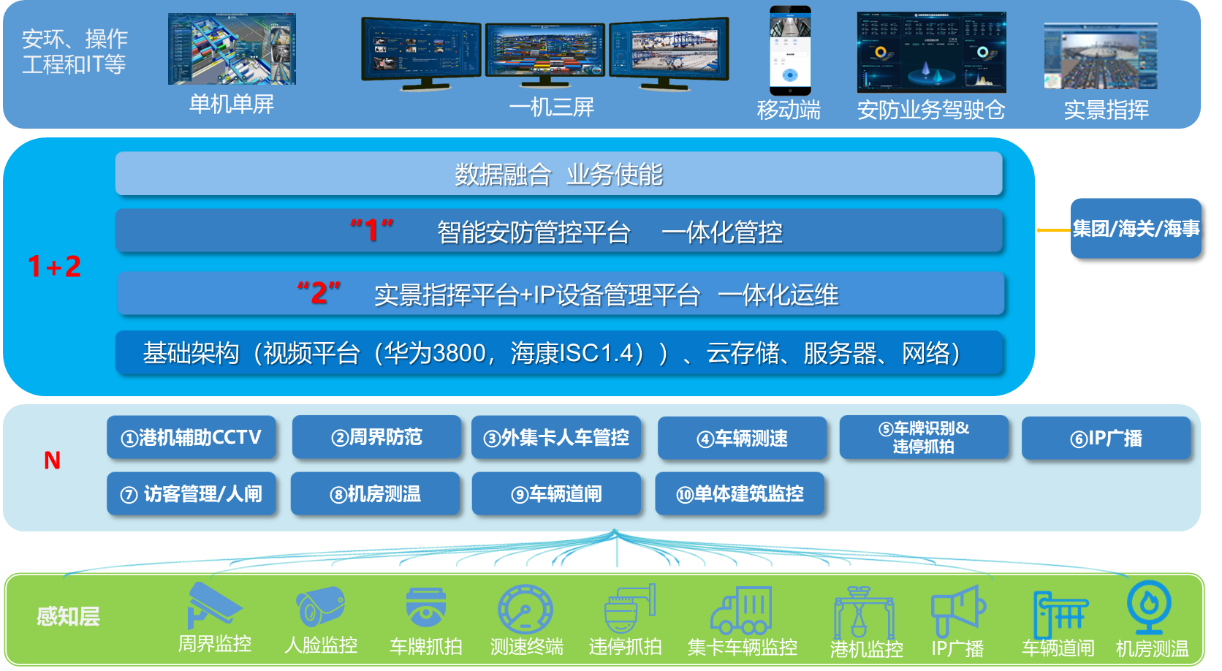 端:該層次對應著碼頭的八種應用場景,包括堆場(U型通道)、輔建區、單體建筑、港機、周界、道路、閘口、停車場等。在每個場景中部署相應的安防設備和系統,以實現對該場景的監控和安全防范。