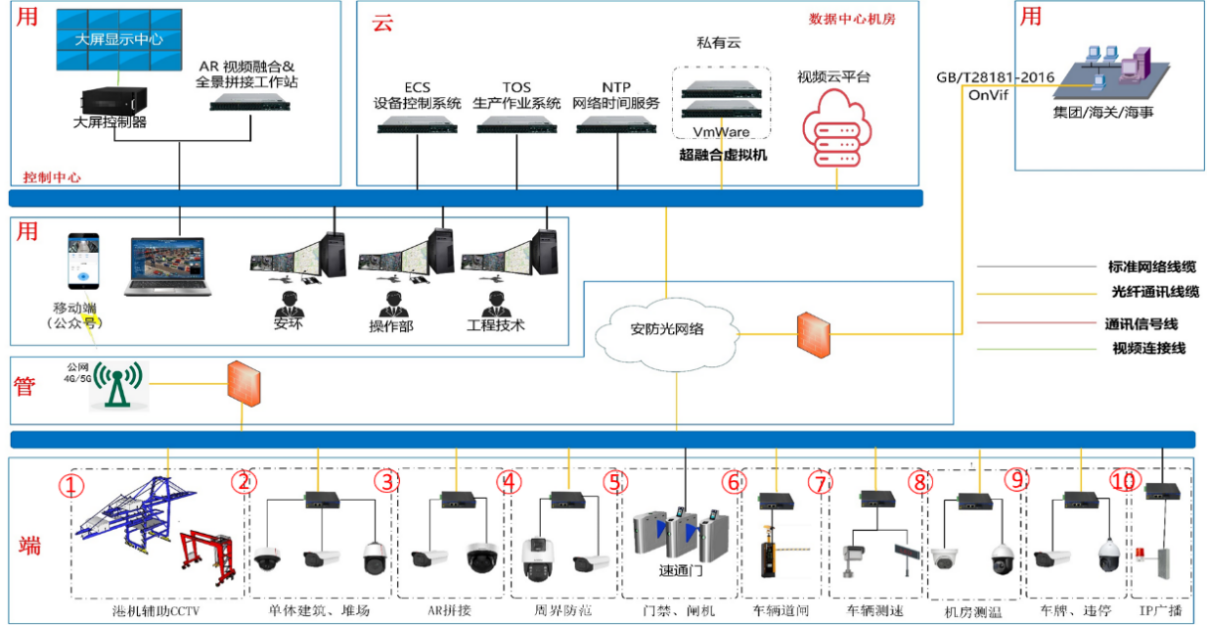 用:該層次涵蓋了三個終端和多個業務部門。三個終端包括數字大屏、專業坐席和單屏,用于實時展示和監控港口的安防情況。同時,三個生產業務部門(安環、操作、工程技術)通過系統進行安全管理和監測。此外,移動端通過公眾號提供標清和高清視頻直播,以及訪客預約功能。上級部門(如集團)和口岸監管單位(如海關、海事)通過GB/T 28181和ONVIF等協議實現與智慧安防管控系統的視頻信息共享。