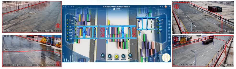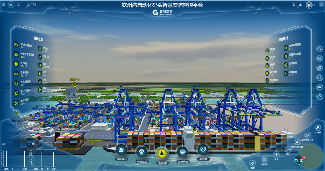 欽州自動化集裝箱碼頭智慧安防管控系統創新點:多部門多業務,雙區人車識別,AR融合,路徑漫游、軌跡追溯、網絡設備監管、多屏交互;
