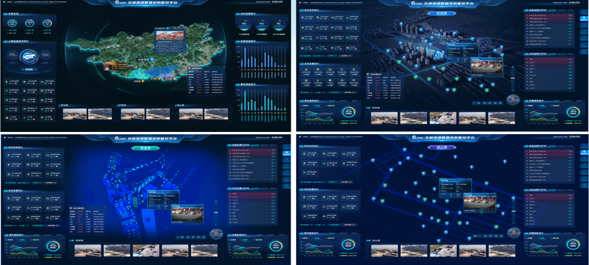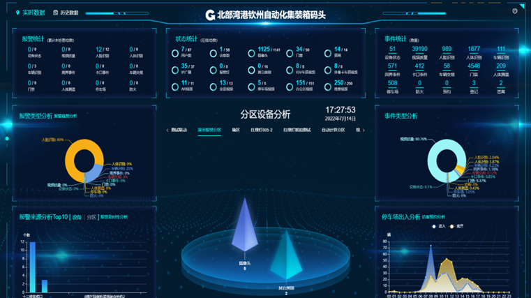 構建三港智慧安防業務“駕駛艙”,進行數據分類、統計分析、圖表數據展示,關鍵點位可以視頻實時輪巡方式顯示;