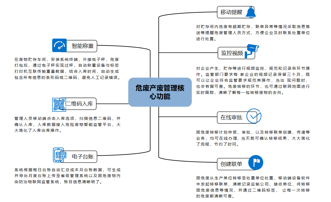 對危險廢物產生、收集、貯存、運輸、利用、處置進行全環節管理,目標做到“來源可查、去向可追、全程留痕”,實現危險廢物產生情況在線申報、管理計劃在線備案、轉移聯單在線運行、利用處置情況在線報告和全過程在線監控??梢哉f,做到危險廢物無論種類多少、數量大小及來自何處,均納入系統線上監管,真正做到應管盡管。