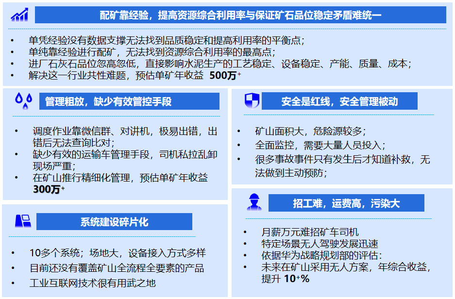 根據露天非金屬礦山企業的實際生產需求,結合行業痛點,通過對礦山穿、爆、裝、運、卸等各個生產環節長期跟蹤調研,全流程收集分析生產數據,采用信息化、數字化、智能化手段,對礦山資源開采、生產計劃、爆破流程、車鏟調度、品位搭配、裝卸計量、安全管理等各個生產環節進行流程優化與管控,解決傳統礦山數字化程度低、生產數據遺失、業務環節分散不互通的難題,實現礦山資源開采的數字化、安全生產的智能化以及智能管控的集成化。