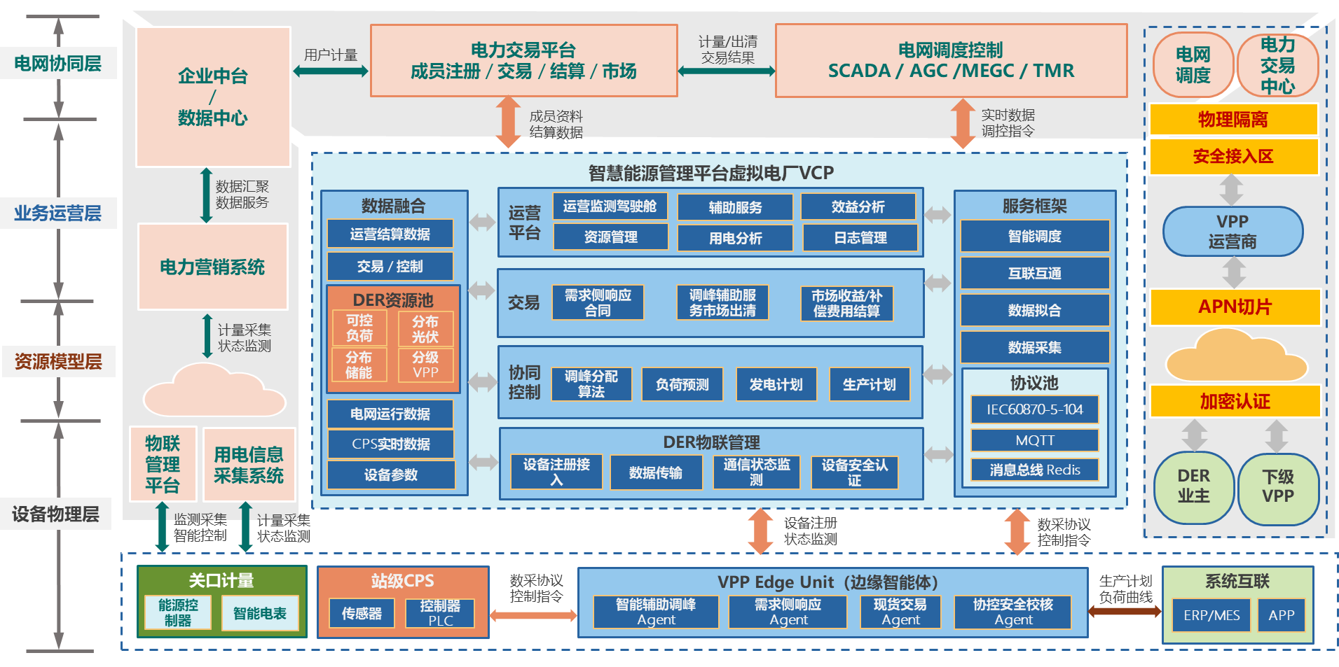 虛擬電廠運營平臺聚合分布式能源和需求側資源參與電網運行,將分布式發電DG、分布式儲能設施和可控負荷有機結合,通過配套的調控技術、通信技術實現對分布式能源進行聚合、優化、協同控制的載體,以作為一個特殊電廠參與電力市場和電網運行,可以看作是一種先進的區域性電能集中管理模式,實現電源側的多能互補和負荷側的靈活互動,其核心在于“聚合”和“通信”。