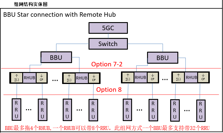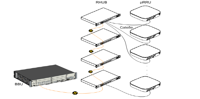 系統(tǒng)組網(wǎng)連接如上圖所示。RHUB使用光電復合纜連接遠端單元RRU,RRU含內(nèi)置天線實現(xiàn)5G信號覆蓋。