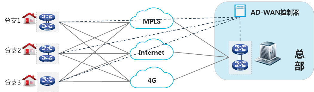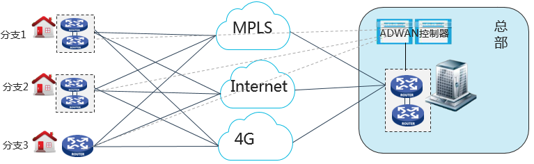 適用于大型企業的總部+多分支接入場景,分支方案主要包含總部和分支兩個層次,支持Internet、MPLS專線、MSTP專線等多種類型鏈路,總部與分支之間一般有多條路經(示例圖中以三條線路舉例說明)。